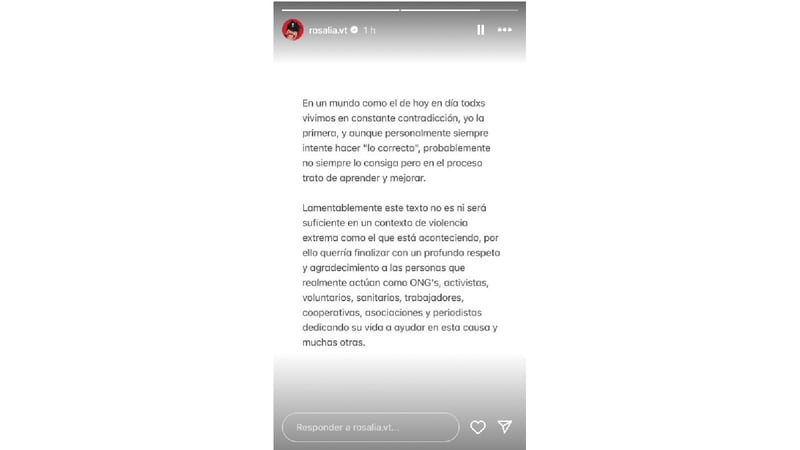 "Lamentablemente, este texto no es ni será suficiente en un contexto de violencia extrema como el que está aconteciendo, por ello querría finalizar con un profundo respeto y agradecimiento a las personas que realmente actúan como ONG's, activistas, voluntarios, sanitarios, trabajadores, cooperativas, asociaciones y periodistas dedicando su vida a ayudar en esta causa y muchas otras", concluye la cantante catalana.