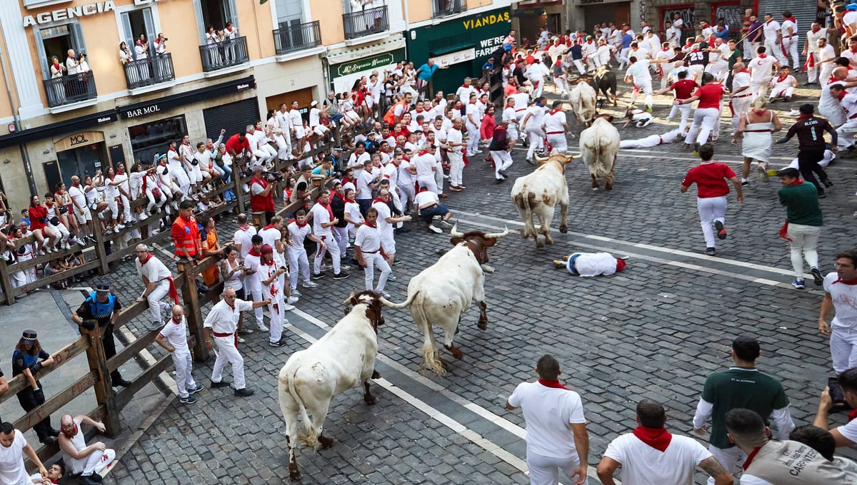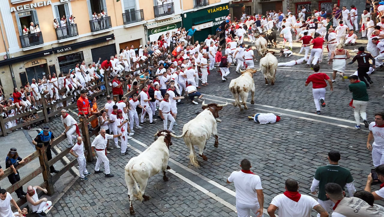 Pamplona amanece vestida de blanco y rojo. Cada día de esta semana de fiesta de Sanfermines a las 08:00 horas comienzan los encierros para guiar a los toros hacia la Monumental de Pamplona. En este recorrido de 875 metros miles de corredores acompañan a los toros en una carrera que suele durar entre dos y tres minutos.