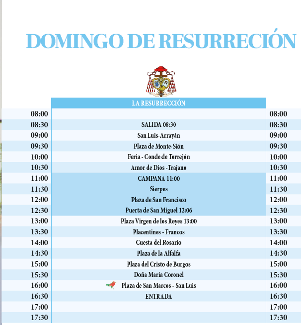 La Resurrección: Salida (08:30), San Luis, Arrayán, Plaza de Monte, Sion, Feria, Conde de Torrejón, Amor de Dios, Trajano, Carrera Oficial (11:00), Plaza Virgen de los Reyes, Placentines, Francos, Cuesta del Rosario, Plaza de la Alfalfa, Plaza del Cristo de Burgos, Doña María Coronel, Plaza de San Marcos, San Luis y recogida (16:30)