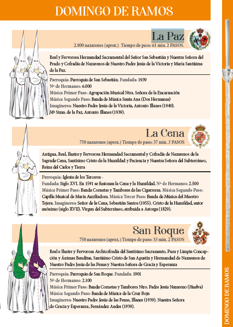 La Cena: Salida (16:15), Capataz Manuel Santiago, Laraña, Orfila, Jesús del Gran Poder, Campana, Plaza, Avenida, P. San Miguel, P. Palos, Alemanes, Francos, Alfalfa, Gerona, recogida (23:00).