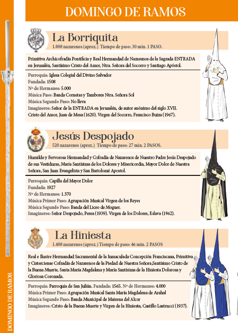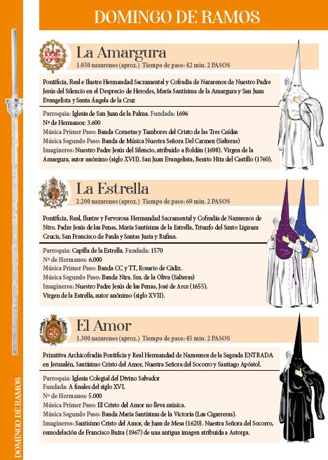 La Borriquita: Salida (14:35), Orfila, Jesús del Gran Poder, Campana, Plaza, P. San Miguel, P. Palos, Chapineros, recogida (18:25).