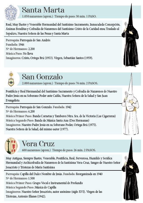 Este lunes 25 de marzo hacen su estación de penitencia El Polígono San Pablo, El Beso de Judas, Santa Genoveva, Santa Marta, San Gonzalo, Vera Cruz, Las Penas, Las Aguas y El Museo