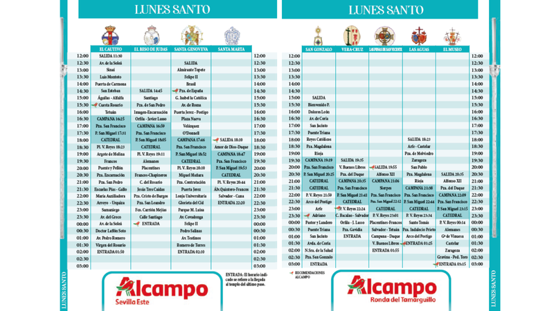 Santa Genoveva: Romero de Torres (12:30), Almirante Topete, Ntra. Sra. de las Mercedes, Felipe II, Diego de la Barrera, Porvenir, Río de la Plata, Brasil, parque de María Luisa, glorieta San Diego, Palos de la Frontera, avda. de Roma, plaza Puerta de Jerez, Avda. de La Constitución, Almirantazgo, Arco del Postigo, Dos de Mayo, Arfe, Puerta del Arenal, Castelar, Gamazo, Joaquín Guichot, Barcelona, plaza Nueva, Tetuán, Velázquez, O’Donnell, Carrera Oficial (17:46), Plaza del Triunfo (20:11) (lados Casa de la Provincia y muralla del Alcázar), Miguel Mañara, plaza de La Contratación, San Gregorio, plaza Puerta de Jerez, San Fernando, cancela principal de la Universidad, lonja de la Universidad, Avda. El Cid, Glorieta San Diego, parque de María Luisa, Felipe II, Bogotá, Pedro Salinas, avda. Ramón Carande, Pedro Salinas, Coullaut Valera, Avda. de los Teatinos y Romero de Torres (2:00).