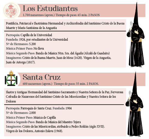 Los Estudiantes: Salida (19:30) Lonja de la Universidad, cancela principal del Rectorado, San Fernando, plaza Puerta de Jerez, San Gregorio, plaza de La Contratación, Miguel Mañara, plaza del Triunfo (lado Archivo de Indias), Fray Ceferino González, Almirantazgo, Arco del Postigo, Dos de Mayo, Arfe, Puerta del Arenal, Castelar, Gamazo, Zaragoza, Badajoz, plaza Nueva (lado oeste), Méndez Núñez, plaza de la Magdalena, O’Donnell, Carrera Oficial (21:46), plaza del Triunfo (lados Casa de la Provincia y muralla del Alcázar), Miguel Mañara, plaza de La Contratación, San Gregorio, plaza Puerta de Jerez, San Fernando, Doña María de Padilla, lonja de la Universidad y recogida (01:45).