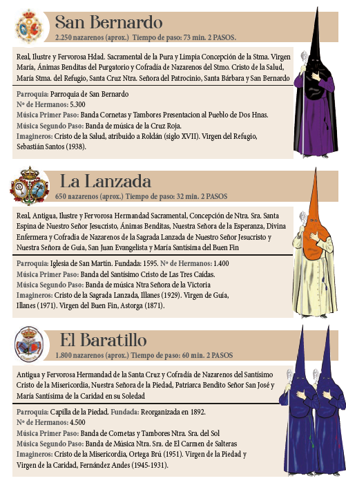Este miércoles 27 de marzo hacen su estación de penitencia Carmen Doloroso, El Buen Fin, La Sed, San Bernardo, La Lanzada, El Baratillo, Los Panaderos, Las Siete Palabras y Cristo de Burgos