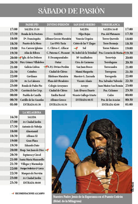Padre Pío: Jesús de la Salud y Clemencia es la primera imagen en procesionar durante el Sábado de Pasión. Salida (15:10) Parroquia San Juan de la Cruz, Doctora, Puebla del Río, Doña Francisquita, Puerto de la Mora, Calatayud, Ntra. Sra. Dolores, Párroco A. Gómez Villalobos, Galicia, Coimbra, Avda. Gavilanes, Doña Francisquita, Ronda Padre Pío, Carrión de los Céspedes, Puebla de Cazalla, Castillo de las Guardas y recogida (0:45). A las 16:00 sale la Virgen de los Dolores, cuya recogida está prevista sobre las 1:30 horas.