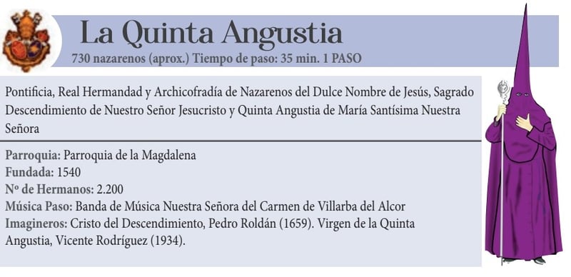 La Quinta Angustia: Salida (19:30) Rioja-Velázquez, Carrera Oficial (20:10), Plaza Virgen de los Reyes, Postigo-Arfe, Plaza Molviedro-Zaragoza y recogida (00:00).