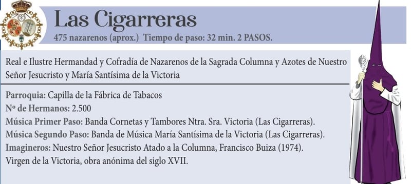 Las Cigarreras: Salida (17:00) Sol-Plaza de los Terceros, Plaza de la Encarnación- Orfila, Trajano-Duque, Carrera Oficial (18:53), Plaza Virgen de los Reyes, Miguel Mañara-Puerta Jerez, Jardines de Murillo, Santa María la Blanca, Plaza Jesús de la Salud, Muñoz y Pabón-Alfalfa, Plaza Cristo de Burgos, Plaza de los Terceros-Sol y recogida (00:35).