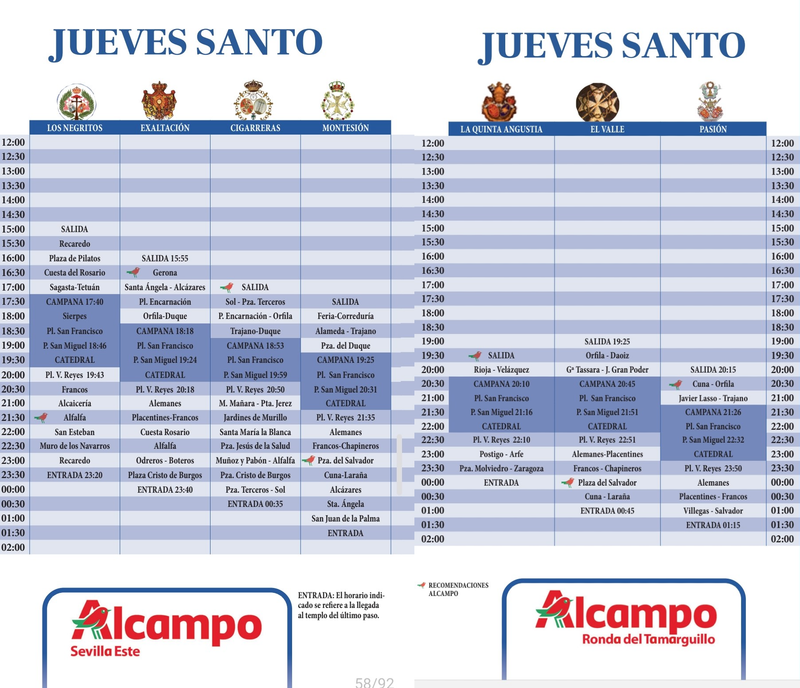 Montesión: Salida (17:30) Feria-Correduría, Alameda-Trajano, Plaza del Duque, Carrera Oficial (19:25), Plaza Virgen de los Reyes, Alemanes, Francos-Chapineros, Plaza del Salvador, Cuna-Laraña, Alcázares, Santa Ángela, San Juan de la Palma y recogida (01:30).