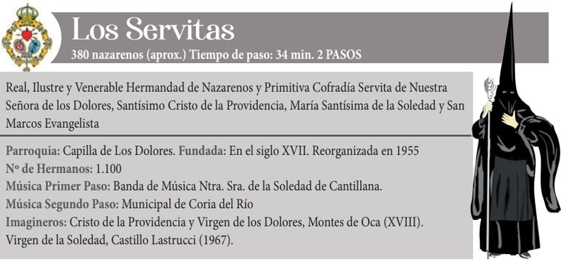 Los Servitas: Salida (15:20) Bustos Tavera, Santa Ángela de la Cruz, Plaza de la Encarnación, Orfila-Javier Lasso, Carrera Oficial (17:35), Plaza Virgen de los Reyes, Cuesta del Rosario, Tres Caídas-Alfalfa, Plaza Cristo de Burgos, Doña María Coronel, Bustos Tavera, Plaza de San Marcos y recogida (22:40).