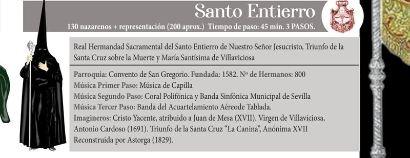 Santo Entierro: Salida (18:45), Carrera Oficial (19:02), Plaza Virgen de los Reyes, Alemanes-Hernando Colón, Plaza Nueva- Tetuán, Velázquez-O´Donnell y recogida (23:00).