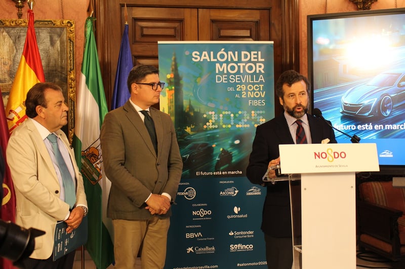 El Ayuntamiento de Sevilla acogió este martes la rueda de prensa donde se dieron a conocer los detalles de este evento por parte del delegado del área de gobierno de Cartuja, Parques Innovadores, Movilidad, Economía y Comercio y distrito Bellavista-La Palmera, Álvaro Jesús Pimentel Siles; el director gerente de la Federación de Empresarios del Metal, FEDEME, Carlos Jacinto Marín y el presidente de la Asociación de Concesionarios de Vehículos de Ocasión de Sevilla, ASOCASIÓN, Manuel Berrocal Jiménez.