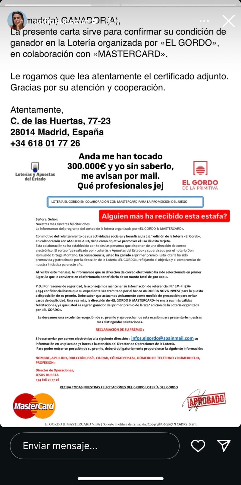 Aunque en el caso de Suescun ha sido una an��cdota, Loterías y Apuestas del Estado ha lanzado un aviso relacionado con estas estafas por suplantaci��n de identidad que está inundando los correos electrónicos de incluso de personas que no han participado en los sorteos.
