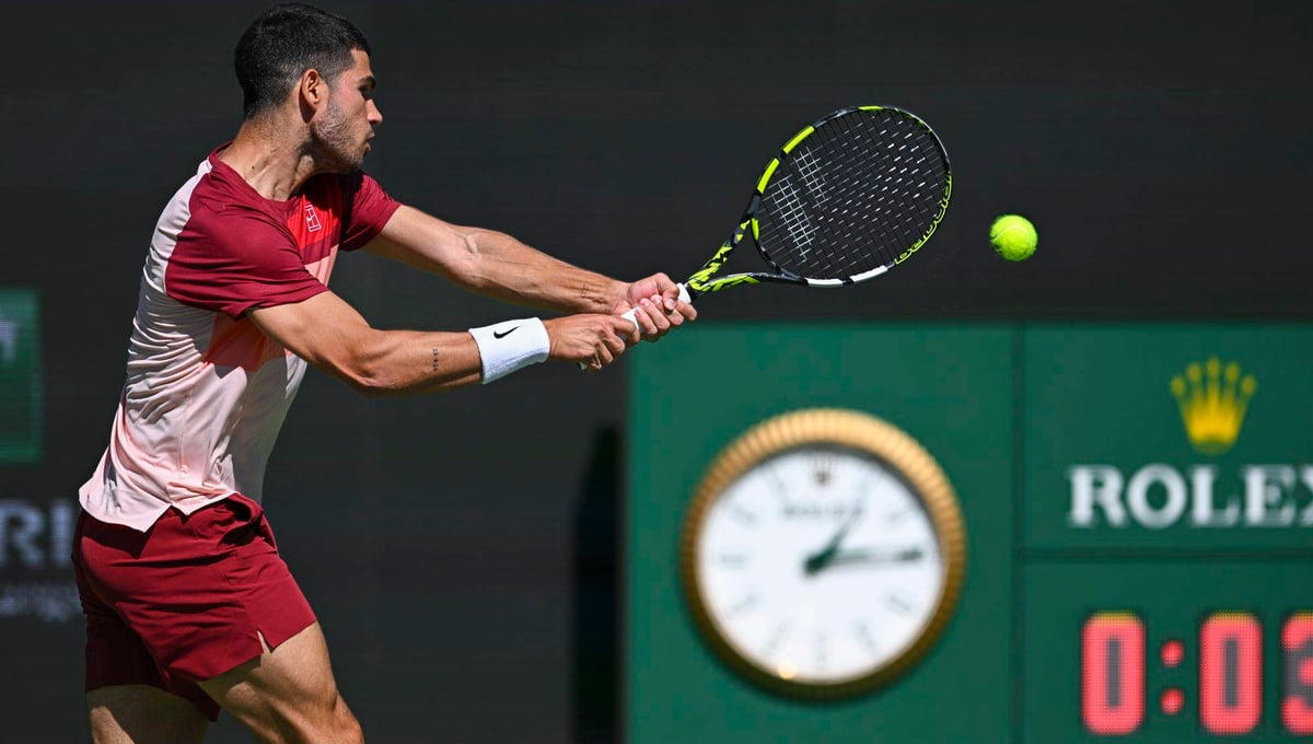 Carlos Alcaraz en su estreno en Indian Wells 2025 mostrando el tatuaje de 23-4-25 en el antebrazo Cordon Press