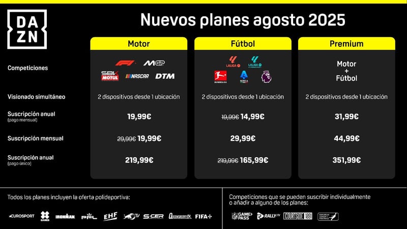 La temporada 2025/2026 arranca en DAZN con una oferta reforzada que convierte a la plataforma en uno de los grandes centros del deporte en streaming. El nuevo Plan Fútbol permitirá seguir LALIGA EA SPORTS, LALIGA HYPERMOTION y las principales ligas europeas, mientras que el Plan Premium añade todo el motor y contenidos originales
