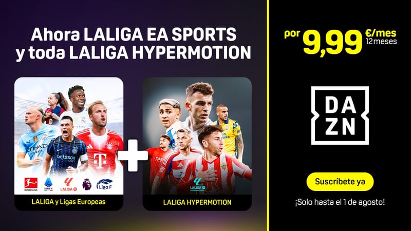 Además, hasta el 1 de agosto, el plan Fútbol de DAZN se puede conseguir por tan solo 9,99 €/mes durante un año (suscripción anual). Es exactamente el mismo precio que tenía la suscripción a LALIGA HYPERMOTION la pasada temporada, que dejará de ofrecerse de forma independiente. A partir del 1 de agosto, la suscripción anual volverá a su precio sin promoción de 19,99 €/mes.