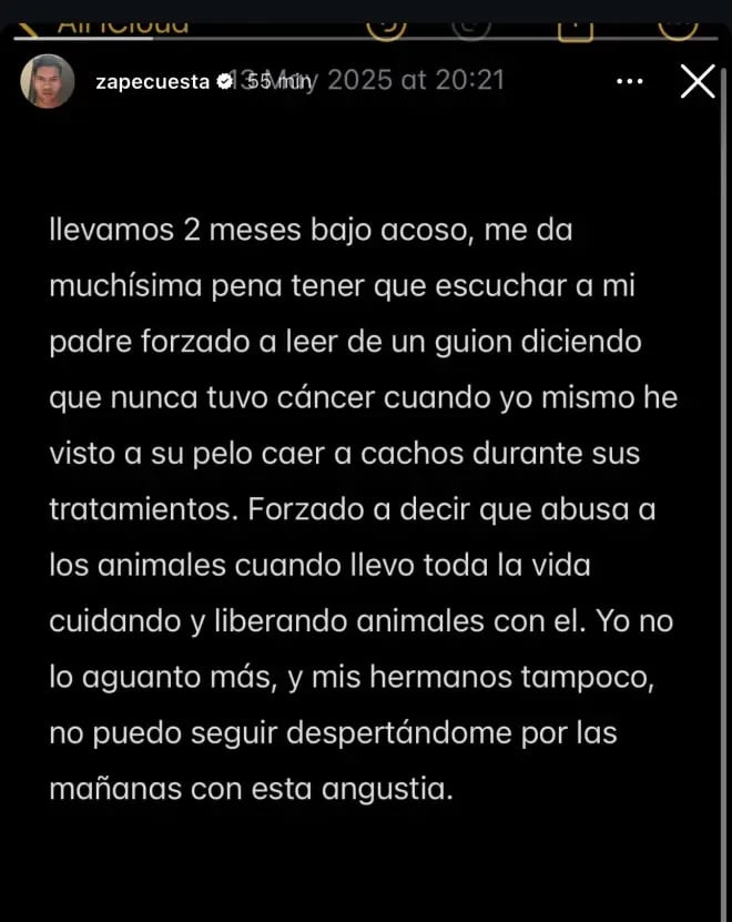 “Ha estado forzado a decir que abusa a los animales cuando lleva toda la vida cuidando y liberando animales con él. Yo no lo aguanto más, y mis hermanos tampoco, no pudo seguir despertándome por las mañanas con esta angustia", concluye Zape Cuesta.