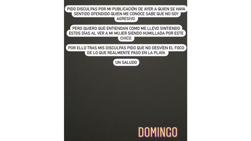 Una vez pedidas las disculpas, Jesé sigue haciendo campaña a favor de su pareja. "Tras mis disculpas, pido que no desvíen el foco de lo que realmente pasó en la playa. Un saludo", cierra el comunicado.