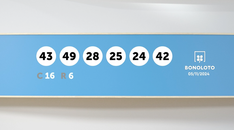 Los números agraciados en el sorteo de la Bonoloto del martes 5 de noviembre de 2024 son los siguientes: 43, 49, 28, 25, 24 y 42. El número complementario es el 16 y el reintegro el 6. En el sorteo de ayer lunes hubo un acertante de primera categoría que se llevó 1.050.000, también hubo dos de segunda categoría que se llevaron más de 67.000 euros cada uno. El bote de este martes es la parte proporcional de la recaudación.