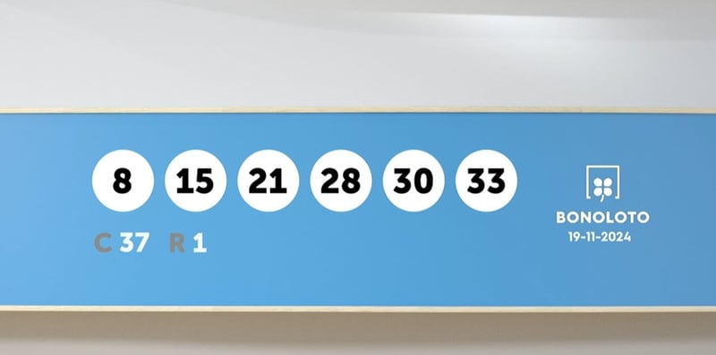 Los números agraciados en el sorteo de la Bonoloto del martes 19 de noviembre de 2024 son los siguientes: 8, 15, 21, 28, 30, 33 y 37. El número complementario es el 37 y el reintegro el 1. En el sorteo de ayer lunes no hubo acertantes de primera categoría, ni tampoco de segunda categoría. El bote de este martes es de 1.800.000 euros.