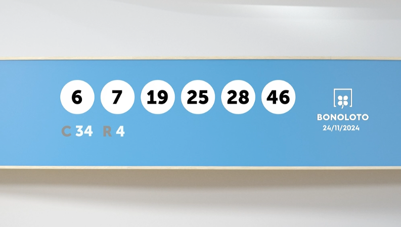 Los números agraciados en el sorteo de la Bonoloto del domingo 24 de noviembre de 2024 son los siguientes: 7, 19, 46, 28, 25, 6. El número complementario es el 34 y el reintegro el 4. En el sorteo de ayer hubo un acertante de primera categoría en Getafe que se llevó 1.174.000 euros. También hubo tres acertantes de segunda categoría que se llevaron cada uno un premio de más de 50.000 euros. El bote de este domingo es la parte proporcional de la recaudación.