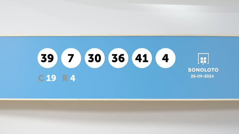 Los números agraciados en el sorteo de la Bonoloto del sábado 28 de septiembre de 2024 son los siguientes: 39, 7, 30, 36, 41 y 4. El número complementario es el 19 y el reintegro el 4. En el sorteo de ayer viernes no hubo acertantes de primera categoría ni de segunda categoría. El bote de este sábado es de 600.000 euros.