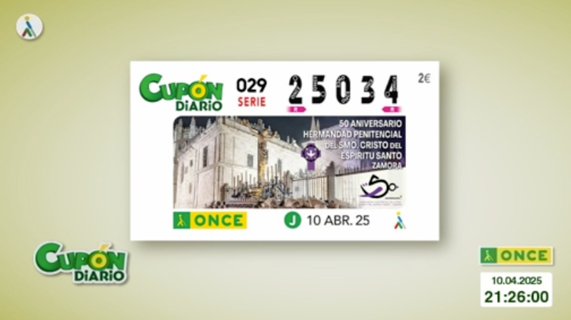 El sorteo del Cuponazo de la ONCE correspondiente al jueves 10 de abril de 2025, que tuvo como número premiado el 25034, con la serie correspondiente al 029. Todos los resultados al completo, tanto de hoy como de fechas anteriores, los podrás ver en la web de ESTADIO Deportivo, siendo recomendable su comprobación también en los canales oficiales de la ONCE.