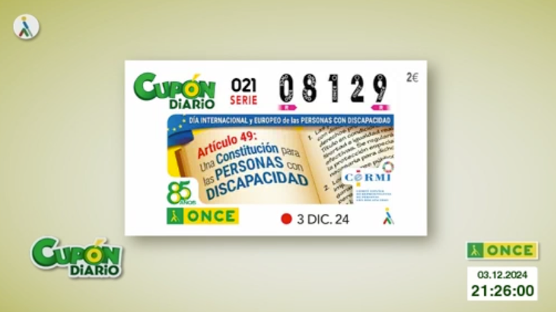 El sorteo del Cupón Diario de la ONCE correspondiente al martes 3 de diciembre de 2024 tuvo como número premiado el 08129, con la serie correspondiente al 021. Todos los resultados al completo, tanto de hoy como de fechas anteriores, los podrás ver en la web de ESTADIO Deportivo, siendo recomendable su comprobación también en los canales oficiales de la ONCE.