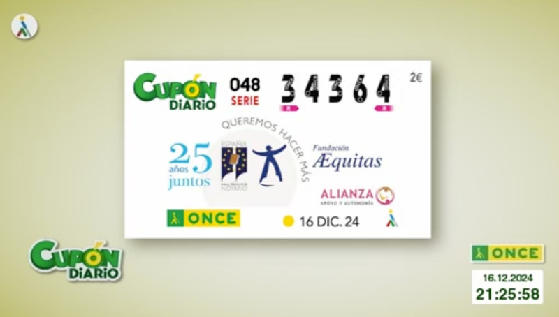 El sorteo del Cupón Diario de la ONCE correspondiente al lunes 16 de diciembre de 2024 tuvo como número premiado el 34364, con la serie correspondiente al 048. Todos los resultados al completo, tanto de hoy como de fechas anteriores, los podrás ver en la web de ESTADIO Deportivo, siendo recomendable su comprobación también en los canales oficiales de la ONCE.