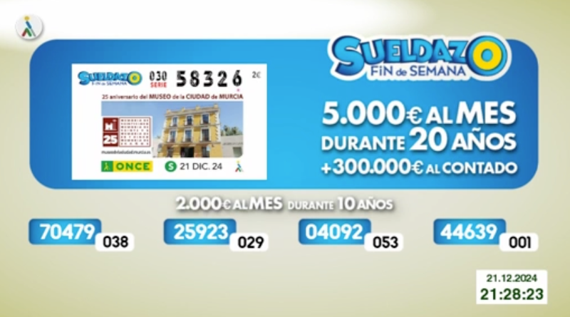 El sorteo del Cupón Diario de la ONCE correspondiente al sábado 21 de diciembre de 2024 se convirtió en algo único para la persona o personas que tenían en su poder el cupón con el número premiado, que al ser sábado era especial, puesto correspondía al del Sueldazo de la Once. Todos resultados al completo, tanto de este sábado como de días anteriores, los podrás ver en la web de ESTADIO Deportivo, siendo recomendable su comprobación también en los canales oficiales de la ONCE. El Sueldazo del fin de semana tiene unos premios distintos a los del Cupón Diario. La primera extracción se lleva 5.000 al mes durante 20 años y un premio de 300.000 euros al contado, mientras que las otras cuatro ganan un sueldo de 2.000 euros al mes durante 10 años.