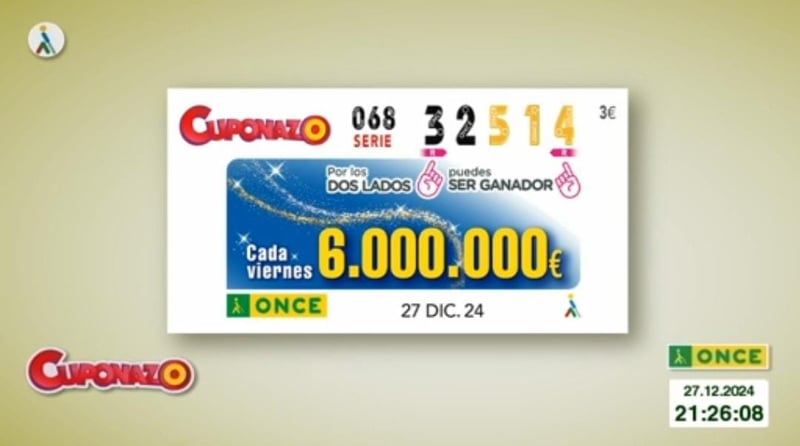 El sorteo del Cuponazo de la ONCE correspondiente al viernes 27 de diciembre de 2024 tuvo como número premiado el 32514, con la serie correspondiente al 068. Todos los resultados al completo, tanto de hoy como de fechas anteriores, los podrás ver en la web de ESTADIO Deportivo, siendo recomendable su comprobación también en los canales oficiales de la ONCE.