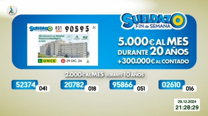 El sorteo del Cupón Diario de la ONCE correspondiente al domingo 29 de diciembre de 2024 se convirtió en algo único para la persona o personas que tenían en su poder el cupón con el número premiado, que al ser sábado era especial, puesto correspondía al del Sueldazo de la Once. Todos resultados al completo, tanto de este sábado como de días anteriores, los podrás ver en la web de ESTADIO Deportivo, siendo recomendable su comprobación también en los canales oficiales de la ONCE. El Sueldazo del fin de semana tiene unos premios distintos a los del Cupón Diario. La primera extracción se lleva 5.000 al mes durante 20 años y un premio de 300.000 euros al contado, mientras que las otras cuatro ganan un sueldo de 2.000 euros al mes durante 10 años.