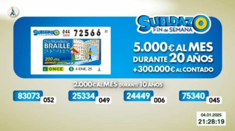 El sorteo del Cupón Diario de la ONCE correspondiente al sábado 4 de enero de 2024 se convirtió en algo único para la persona o personas que tenían en su poder el cupón con el número premiado, que al ser sábado era especial, puesto correspondía al del Sueldazo de la Once. Todos resultados al completo, tanto de este sábado como de días anteriores, los podrás ver en la web de ESTADIO Deportivo, siendo recomendable su comprobación también en los canales oficiales de la ONCE. El Sueldazo del fin de semana tiene unos premios distintos a los del Cupón Diario. La primera extracción se lleva 5.000 al mes durante 20 años y un premio de 300.000 euros al contado, mientras que las otras cuatro ganan un sueldo de 2.000 euros al mes durante 10 años.