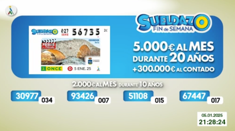 El sorteo del Cupón Diario de la ONCE correspondiente al domingo 5 de enero de 2024 se convirtió en algo único para la persona o personas que tenían en su poder el cupón con el número premiado, que al ser sábado era especial, puesto correspondía al del Sueldazo de la Once. Todos resultados al completo, tanto de este sábado como de días anteriores, los podrás ver en la web de ESTADIO Deportivo, siendo recomendable su comprobación también en los canales oficiales de la ONCE. El Sueldazo del fin de semana tiene unos premios distintos a los del Cupón Diario. La primera extracción se lleva 5.000 al mes durante 20 años y un premio de 300.000 euros al contado, mientras que las otras cuatro ganan un sueldo de 2.000 euros al mes durante 10 años.