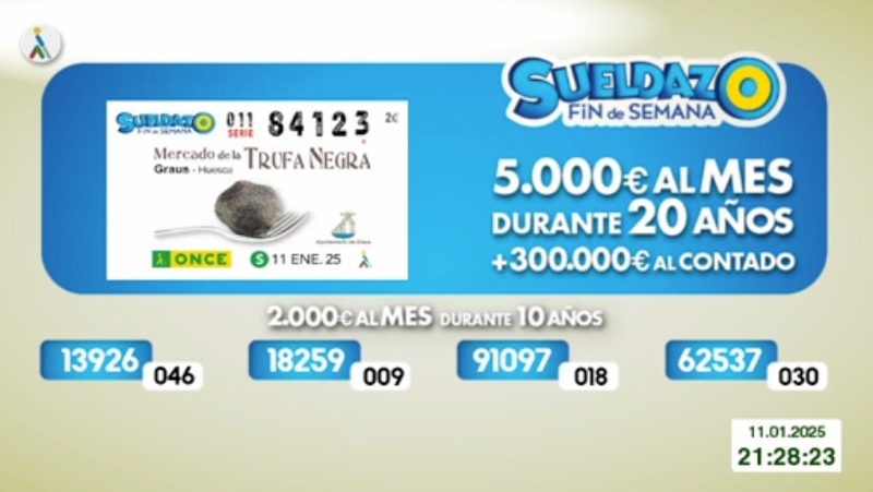 El sorteo del Cupón Diario de la ONCE correspondiente al sábado 11 de enero de 2024 se convirtió en algo único para la persona o personas que tenían en su poder el cupón con el número premiado, que al ser sábado era especial, puesto correspondía al del Sueldazo de la Once. Todos resultados al completo, tanto de este sábado como de días anteriores, los podrás ver en la web de ESTADIO Deportivo, siendo recomendable su comprobación también en los canales oficiales de la ONCE. El Sueldazo del fin de semana tiene unos premios distintos a los del Cupón Diario. La primera extracción se lleva 5.000 al mes durante 20 años y un premio de 300.000 euros al contado, mientras que las otras cuatro ganan un sueldo de 2.000 euros al mes durante 10 años.