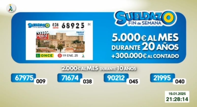 El sorteo del Cupón Diario de la ONCE correspondiente al domingo 19 de enero de 2024 se convirtió en algo único para la persona o personas que tenían en su poder el cupón con el número premiado, que al ser sábado era especial, puesto correspondía al del Sueldazo de la Once. Todos resultados al completo, tanto de este sábado como de días anteriores, los podrás ver en la web de ESTADIO Deportivo, siendo recomendable su comprobación también en los canales oficiales de la ONCE. El Sueldazo del fin de semana tiene unos premios distintos a los del Cupón Diario. La primera extracción se lleva 5.000 al mes durante 20 años y un premio de 300.000 euros al contado, mientras que las otras cuatro ganan un sueldo de 2.000 euros al mes durante 10 años.
