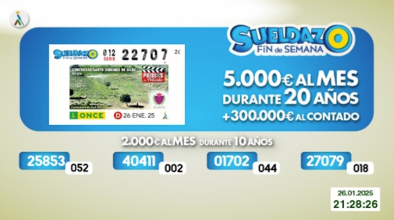 El sorteo del Cupón Diario de la ONCE correspondiente al domingo 26 de enero de 2025 se convirtió en algo único para la persona o personas que tenían en su poder el cupón con el número premiado, que al ser sábado era especial, puesto correspondía al del Sueldazo de la Once. Todos resultados al completo, tanto de este sábado como de días anteriores, los podrás ver en la web de ESTADIO Deportivo, siendo recomendable su comprobación también en los canales oficiales de la ONCE. El Sueldazo del fin de semana tiene unos premios distintos a los del Cupón Diario. La primera extracción se lleva 5.000 al mes durante 20 años y un premio de 300.000 euros al contado, mientras que las otras cuatro ganan un sueldo de 2.000 euros al mes durante 10 años.