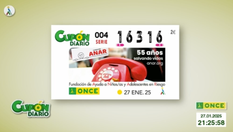 El sorteo del Cupón Diario de la ONCE correspondiente al lunes 27 de enero de 2025 tuvo como número premiado el 16316, con la serie correspondiente al 4. Todos los resultados al completo, tanto de hoy como de fechas anteriores, los podrás ver en la web de ESTADIO Deportivo, siendo recomendable su comprobación también en los canales oficiales de la ONCE.