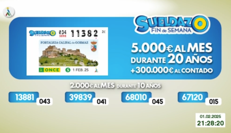 El sorteo del Cupón Diario de la ONCE correspondiente al sábado 1 de febrero de 2025 se convirtió en algo único para la persona o personas que tenían en su poder el cupón con el número premiado, que al ser sábado era especial, puesto correspondía al del Sueldazo de la Once. Todos resultados al completo, tanto de este sábado como de días anteriores, los podrás ver en la web de ESTADIO Deportivo, siendo recomendable su comprobación también en los canales oficiales de la ONCE. El Sueldazo del fin de semana tiene unos premios distintos a los del Cupón Diario. La primera extracción se lleva 5.000 al mes durante 20 años y un premio de 300.000 euros al contado, mientras que las otras cuatro ganan un sueldo de 2.000 euros al mes durante 10 años.