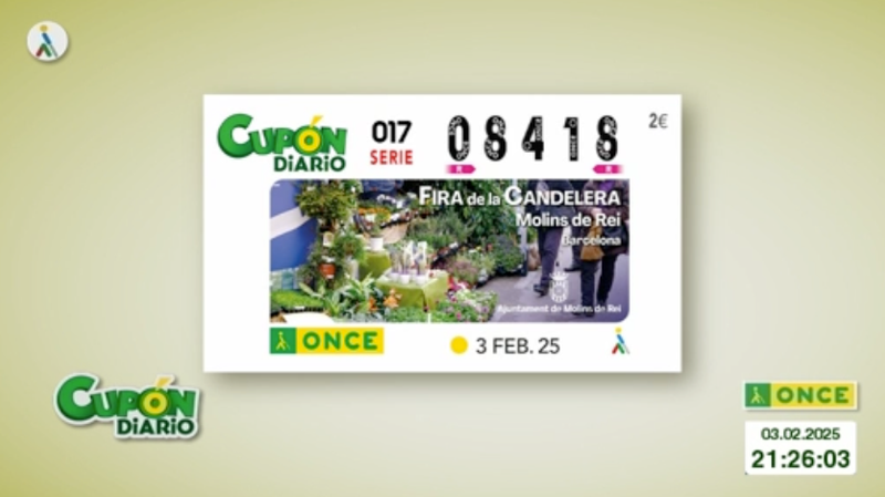 El sorteo del Cupón Diario de la ONCE correspondiente al lunes 3 de febrero de 2025 tuvo como número premiado el 08418, con la serie correspondiente al 17. Todos los resultados al completo, tanto de hoy como de fechas anteriores, los podrás ver en la web de ESTADIO Deportivo, siendo recomendable su comprobación también en los canales oficiales de la ONCE.