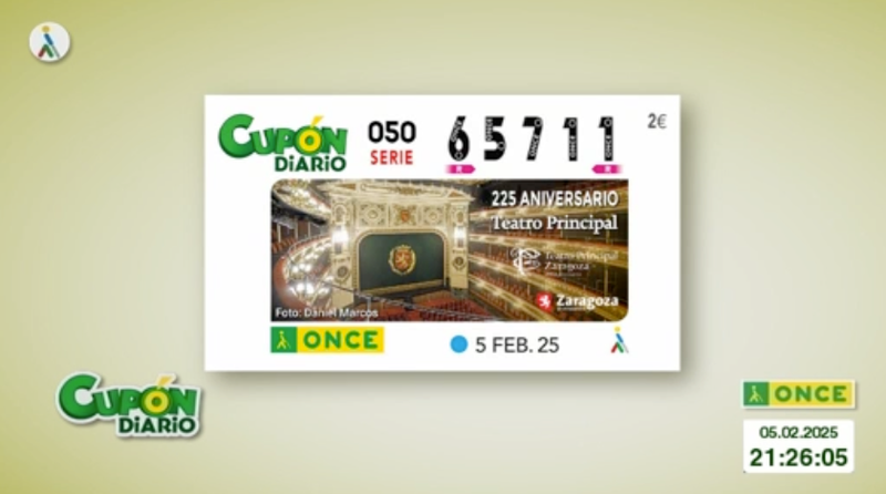 El sorteo del Cupón Diario de la ONCE correspondiente al miércoles 5 de febrero de 2025 tuvo como número premiado el 65711, con la serie correspondiente al 50. Todos los resultados al completo, tanto de hoy como de fechas anteriores, los podrás ver en la web de ESTADIO Deportivo, siendo recomendable su comprobación también en los canales oficiales de la ONCE.