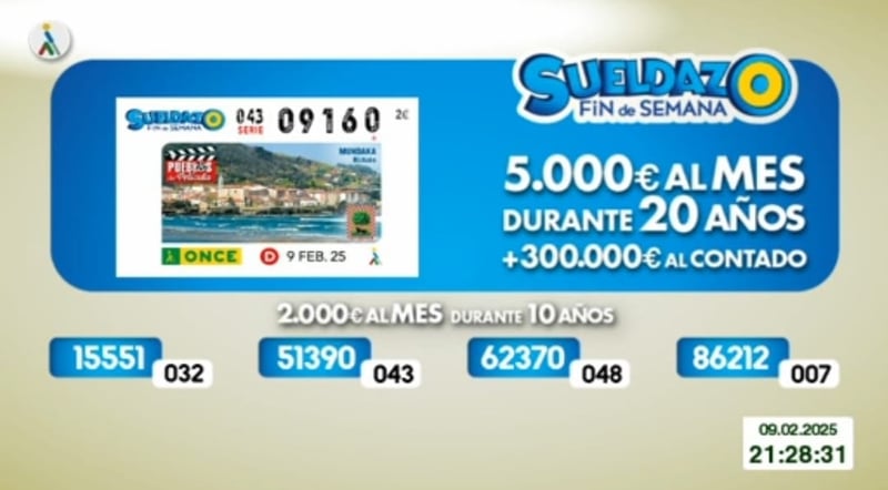 El sorteo del Cupón Diario de la ONCE correspondiente al domingo 9 de febrero de 2025 se convirtió en algo único para la persona o personas que tenían en su poder el cupón con el número premiado, que al ser sábado era especial, puesto correspondía al del Sueldazo de la Once. Todos resultados al completo, tanto de este sábado como de días anteriores, los podrás ver en la web de ESTADIO Deportivo, siendo recomendable su comprobación también en los canales oficiales de la ONCE. El Sueldazo del fin de semana tiene unos premios distintos a los del Cupón Diario. La primera extracción se lleva 5.000 al mes durante 20 años y un premio de 300.000 euros al contado, mientras que las otras cuatro ganan un sueldo de 2.000 euros al mes durante 10 años.