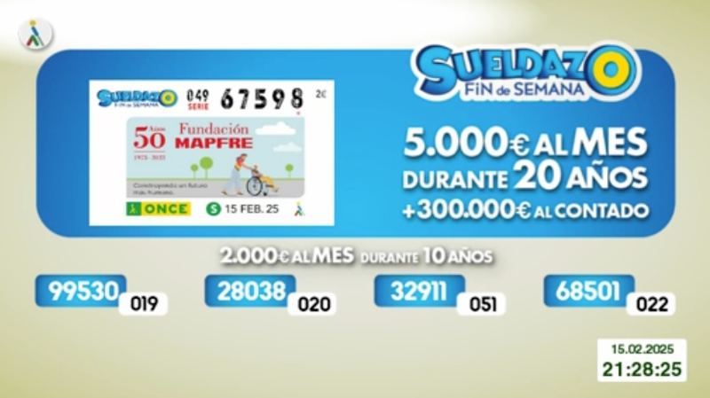El sorteo del Cupón Diario de la ONCE correspondiente al sábado 15 de febrero de 2025 se convirtió en algo único para la persona o personas que tenían en su poder el cupón con el número premiado, que al ser sábado era especial, puesto correspondía al del Sueldazo de la Once. Todos resultados al completo, tanto de este sábado como de días anteriores, los podrás ver en la web de ESTADIO Deportivo, siendo recomendable su comprobación también en los canales oficiales de la ONCE. El Sueldazo del fin de semana tiene unos premios distintos a los del Cupón Diario. La primera extracción se lleva 5.000 al mes durante 20 años y un premio de 300.000 euros al contado, mientras que las otras cuatro ganan un sueldo de 2.000 euros al mes durante 10 años.