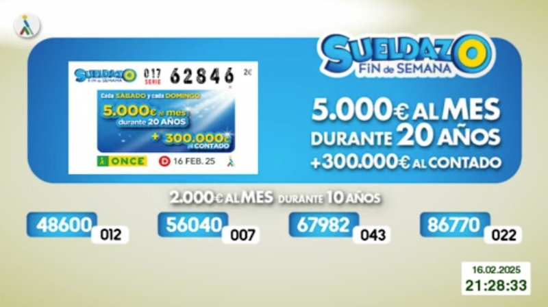 El sorteo del Cupón Diario de la ONCE correspondiente al domingo 16 de febrero de 2025 se convirtió en algo único para la persona o personas que tenían en su poder el cupón con el número premiado, que al ser sábado era especial, puesto correspondía al del Sueldazo de la Once. Todos resultados al completo, tanto de este sábado como de días anteriores, los podrás ver en la web de ESTADIO Deportivo, siendo recomendable su comprobación también en los canales oficiales de la ONCE. El Sueldazo del fin de semana tiene unos premios distintos a los del Cupón Diario. La primera extracción se lleva 5.000 al mes durante 20 años y un premio de 300.000 euros al contado, mientras que las otras cuatro ganan un sueldo de 2.000 euros al mes durante 10 años.