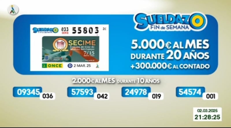 El sorteo del Cupón Diario de la ONCE correspondiente al domingo 2 de marzo de 2025 se convirtió en algo único para la persona o personas que tenían en su poder el cupón con el número premiado, que al ser sábado era especial, puesto correspondía al del Sueldazo de la Once. Todos resultados al completo, tanto de este sábado como de días anteriores, los podrás ver en la web de ESTADIO Deportivo, siendo recomendable su comprobación también en los canales oficiales de la ONCE. El Sueldazo del fin de semana tiene unos premios distintos a los del Cupón Diario. La primera extracción se lleva 5.000 al mes durante 20 años y un premio de 300.000 euros al contado, mientras que las otras cuatro ganan un sueldo de 2.000 euros al mes durante 10 años.