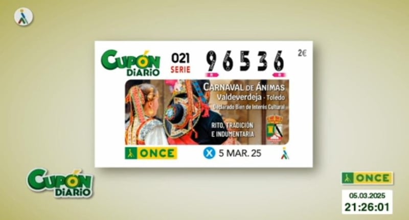 El sorteo del Cupón Diario de la ONCE correspondiente al miércoles 5 de febrero de 2025 tuvo como número premiado el 96.536, con la serie correspondiente al 021. Todos los resultados al completo, tanto de hoy como de fechas anteriores, los podrás ver en la web de ESTADIO Deportivo, siendo recomendable su comprobación también en los canales oficiales de la ONCE.
