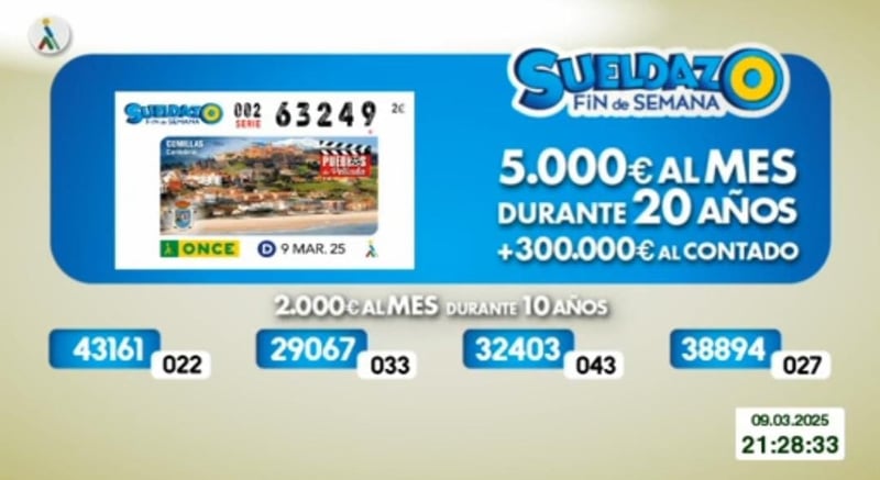 El sorteo del Cupón Diario de la ONCE correspondiente al domingo 9 de marzo de 2025 se convirtió en algo único para la persona o personas que tenían en su poder el cupón con el número premiado, que al ser sábado era especial, puesto correspondía al del Sueldazo de la Once. Todos resultados al completo, tanto de este sábado como de días anteriores, los podrás ver en la web de ESTADIO Deportivo, siendo recomendable su comprobación también en los canales oficiales de la ONCE. El Sueldazo del fin de semana tiene unos premios distintos a los del Cupón Diario. La primera extracción se lleva 5.000 al mes durante 20 años y un premio de 300.000 euros al contado, mientras que las otras cuatro ganan un sueldo de 2.000 euros al mes durante 10 años.