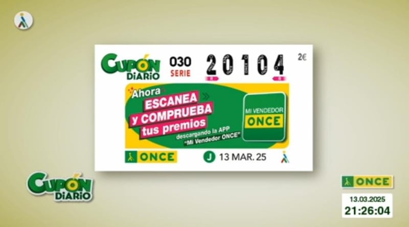 El sorteo del Cupón Diario de la ONCE correspondiente al jueves 13 de marzo de 2025 tuvo como número premiado el 20.104, con la serie correspondiente al 030. Todos los resultados al completo, tanto de hoy como de fechas anteriores, los podrás ver en la web de ESTADIO Deportivo, siendo recomendable su comprobación también en los canales oficiales de la ONCE.