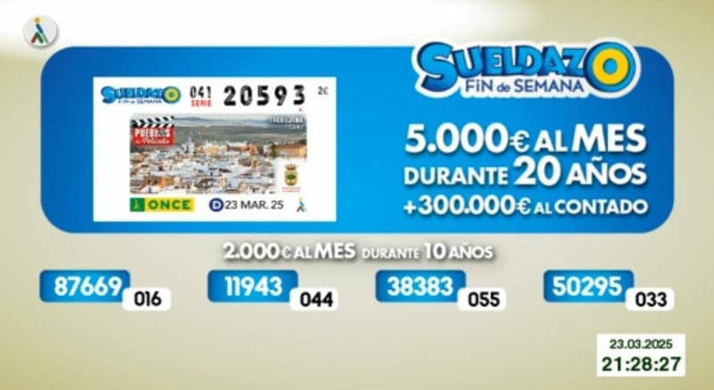 El sorteo del Cupón Diario de la ONCE correspondiente al domingo 23 de marzo de 2025 se convirtió en algo único para la persona o personas que tenían en su poder el cupón con el número premiado, que al ser sábado era especial, puesto correspondía al del Sueldazo de la Once. Todos resultados al completo, tanto de este sábado como de días anteriores, los podrás ver en la web de ESTADIO Deportivo, siendo recomendable su comprobación también en los canales oficiales de la ONCE. El Sueldazo del fin de semana tiene unos premios distintos a los del Cupón Diario. La primera extracción se lleva 5.000 al mes durante 20 años y un premio de 300.000 euros al contado, mientras que las otras cuatro ganan un sueldo de 2.000 euros al mes durante 10 años.