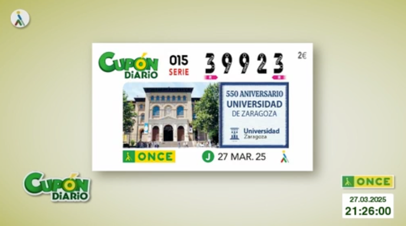 El sorteo del Cuponazo de la ONCE correspondiente al jueves 27 de marzo de 2025, que tuvo como número premiado el 39923, con la serie correspondiente al 015. Todos los resultados al completo, tanto de hoy como de fechas anteriores, los podrás ver en la web de ESTADIO Deportivo, siendo recomendable su comprobación también en los canales oficiales de la ONCE.